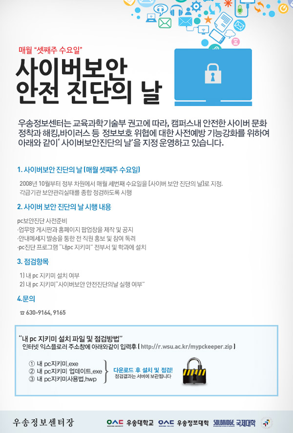 우송정보센터는 교육과학기술부 권고에 따라, 캠퍼스내 안전한 사이버 문화 정착과 해킹, 바이러스 등 정보보호 위협에 대한 사전예방 기능강화를 위하여 아리와 같이 '사이버 보안 진단의 날'을 지정 운영하고 있습니다.