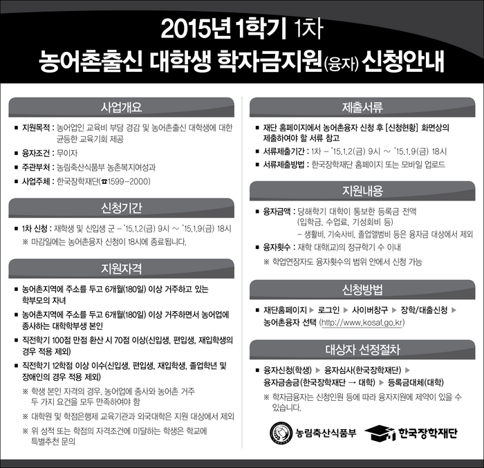 대학광장 공지사항 코로나19 공지사항 혁신지원사업단 LINC 3.0 사업단 공지사항 새소식 보도자료 학과별 명장 Story 입찰정보 공지사항 홈 대학광장 공지사항 2015학년 1학기 농어촌융자 신청 안내 카테고리 : | 작성자 : 관리자 | 작성일 : 2015.01.05 | 조회수 : 11,438 첨부파일 [1]1222한국장학재단_농어촌학자금지원공5단반_180x174.jpg 목록
