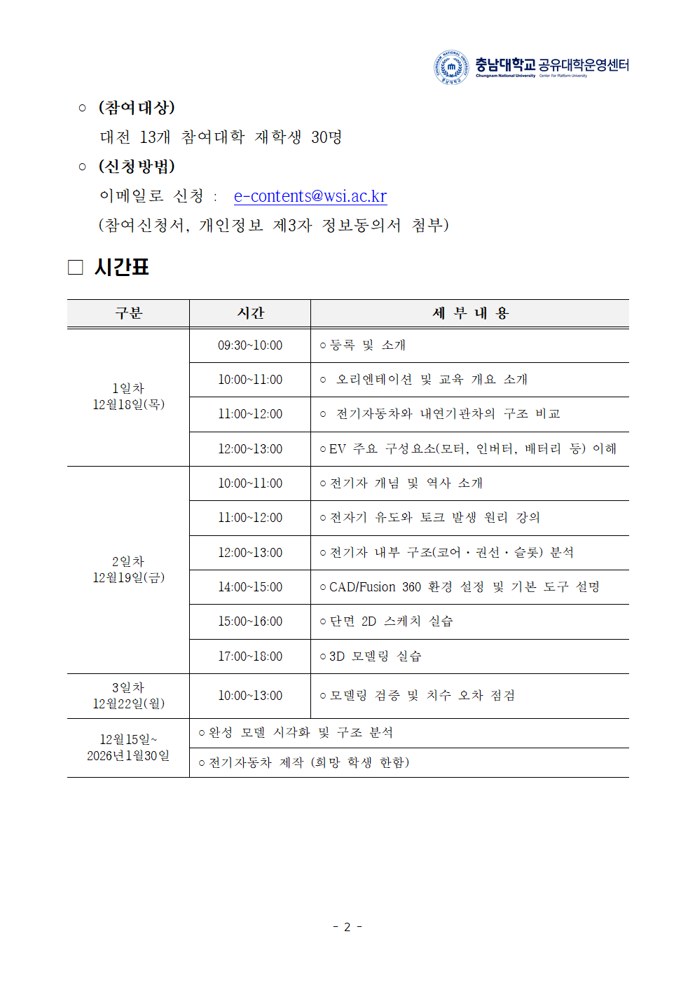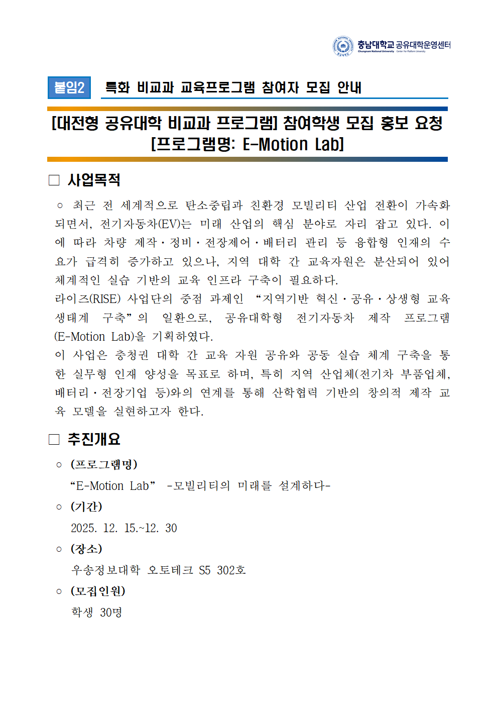 대학광장 공지사항 코로나19 공지사항 혁신지원사업단 LINC 3.0 사업단 공지사항 새소식 보도자료 학과별 명장 Story 입찰정보 RISE 사업단 공지사항 홈 대학광장 RISE 사업단 공지사항 [대전형 공유대학 비교과 프로그램] 참여학생 모집 홍보 요청 [프로그램명: E-Motion Lab] 카테고리 : | 작성일 : 2025.12.08 | 조회수 : 1,255 하단의 첨부 파일(특화 비교과 교육프로그램 참여자 모집 안내) 을 작성→ mailto:e-contents@wsi.ac.kr 클릭 → G-mail로 제출 ※ 아래의 첨부파일 (특화 비교과 교육프로그램 참여자 모집 안내)을 작성해서 해당 G-mail을 통해 제출해주시기 바랍니다 첨부파일 [1]모집 요청서.bmp [1]모집요청서 2.bmp 특화 비교과 교육프로그램 참여자 모집 안내.hwp 목록